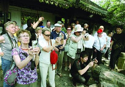世博游热得发烫,苏州也迎来了一拨又一拨的世博旅客,图为在著名景点拙政园中,中外旅客用手中的相机“带走”园林美景。 □记者华雪根摄