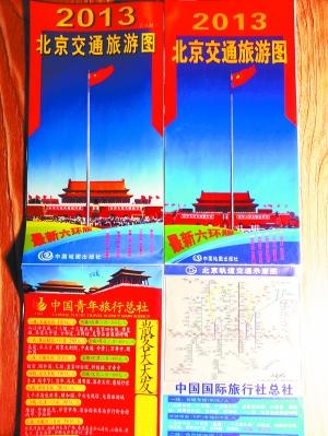 记者较量两本同样写着“2013北京交通旅游图”的舆图,一份购于故宫,一份购于北京站。舆图封面同样都以天安门为配景,两份舆图选取的是差异的照片,但整体上十分相似。从封面上看除了印制的颜色以及照片细节差异外,其他内容均沟通,出书单元都是“中国舆图出书社”。