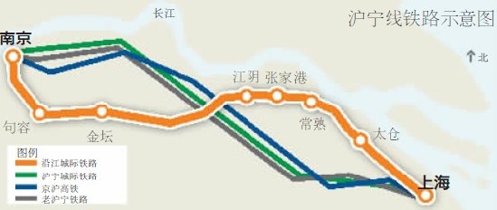 从详细的线路走向上,沿江城际铁路起自南京,经镇江(句容市)、常州(金坛市、武进区、戚墅堰区)、无锡(惠山区、江阴市)、苏州(张家港、常熟、太仓市)等地至上海。正好包围了前3条沪宁通道未路过的句容、金坛、江阴、张家港、常熟、太仓等经济发家、城镇麋集的地域。