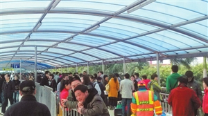 接报后记者上午7时来到皇岗口岸,只见皇岗联检大楼前人行天桥上站了一两百名外省游客。