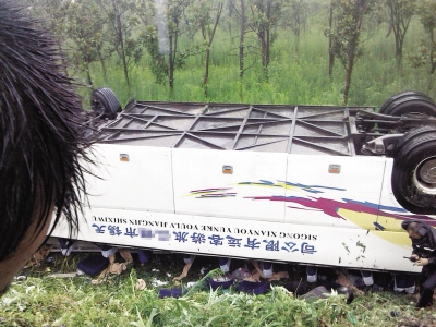 “车上一共44人,包括一位司机和一位导游,大多数是年轻人,其中有5人来自靖江,都是学生。”小高当时坐在第三排,对事情整个经过记忆犹新。他说,上午9点多,汽车在高速公路上抛锚了,随后,他们换乘了另外一辆车。下午近1点,雨下得正大,突然,司机猛地往左打方向盘,大巴就跟着往左冲,一下子就冲到了路中间的绿化带,司机又拼命往右打方向盘,结果大巴撞上高速路边护栏一路冲下去,直接翻到高速下面的路基上。