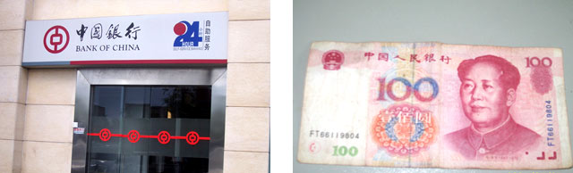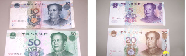 The Chinese currency is RMB (CNY), including paper money in 100, 50, 20, 10, 5, 2 and 1 yuan and in 5,2 and 1 jiao; and the coin in 1 yuan, and 5,1 jiao and 5,2,1 fen.