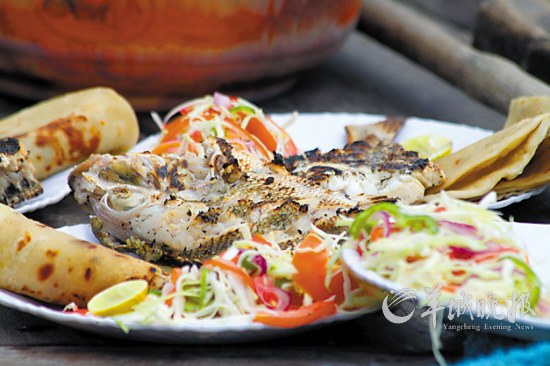 我们的午餐准备好了,烤鱼、沙拉和大饼