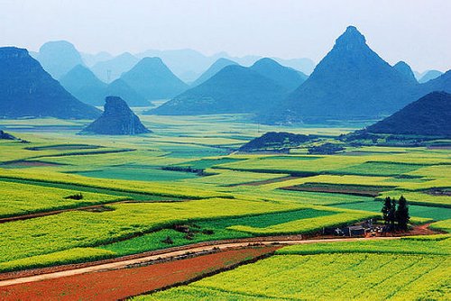 1.县城东北方向的金鸡峰。登上金鸡峰,看油菜花田比较平坦,而稍远处有些孤峰拔起,很壮阔的感觉。很多罗平花海的照片都是这里拍的。