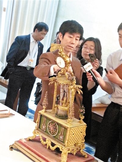 故宫博物院宫廷部研究员郭福祥介绍清代铜镀金转花水法人打钟受损环境。(图:新华社)