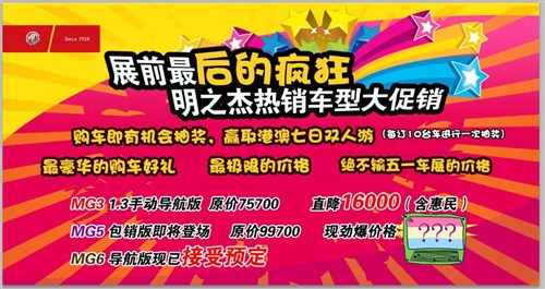 每十位订车就抽一轮,越早订车越实惠,可以重复参加抽奖,取较高的奖项。MG5 特供包销版,原价99700,本日的售价???是什么呢?等您来发表!