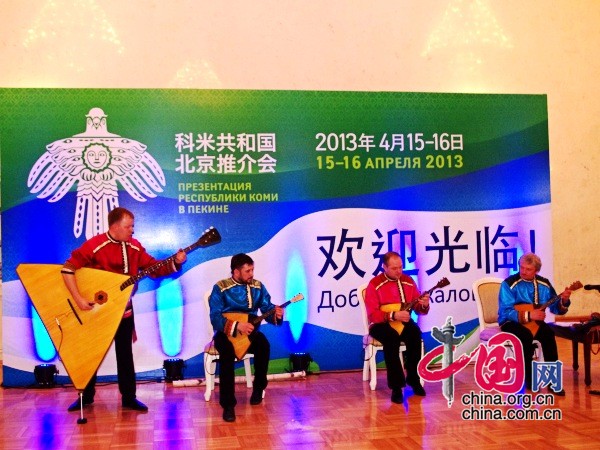 俄罗斯联邦科米共和国推介会于4月15日在俄罗斯驻华使馆举行,还未走进使馆已经能听到美妙的音乐声,四位当地乐手演奏着传统乐器,用欢快的音乐欢迎客人。现场有四十余幅摄影作品和一些手工艺品,从这些展出的作品中不难发现科米共和国贴近大自然的特点。推介会上,总统瓦切斯拉夫·米哈伊洛维奇·盖泽尔就该国能源、工业、旅游、科学教育、经贸合作领域的现状以及投资合作的发展方向等做了详细介绍,其中他提到:科米共和国的面积约等于法国,却有74%的森林覆盖率和200多个自然保护区。他说:“乌拉尔腹地没有柏油马路也没有宾馆,这里虽然相对闭塞,却很好地避免了文化的侵蚀。”
